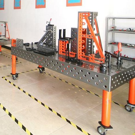 焊接工作臺是一種多用途焊接工裝平臺工藝裝備集焊接,裝配,檢驗為一體.具有三維柔性組合焊接工裝夾具同樣的互換性,通用性,經濟性等優點;與普通平板焊臺對比可以提高工作效率,節省原材料,節省資金;使用過程中可選擇多樣式的三維組合標準夾具配件進行夾緊定位加工作業,操作簡單、使用方便。為產品快速上市贏得競爭機遇.默認為D28系列,孔徑D28mm,孔距100mm;表面平面度高達0.05/1000mm,硬度可達38-45HRC,可做作為焊接過程中產品檢驗平臺使用。同時它具有定位準確,拆卸方便,互換性高等特點,為焊接行業提供了一種標準化的柔性焊接工藝裝備,改變焊接車間傳統的落后面貌,是焊工的好幫手,是焊接車間的環寶的象征,為公司7S工作提供強有力保證。同時也為機器人代替人工打好了堅實的基礎。